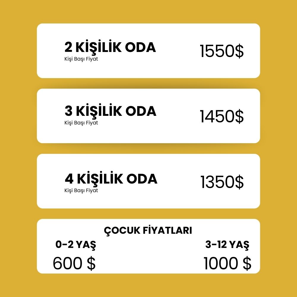 Kayıt esnasında ödemenin %50 si kalan bakiye gitmeden 15 gün önce yapılacaktır.